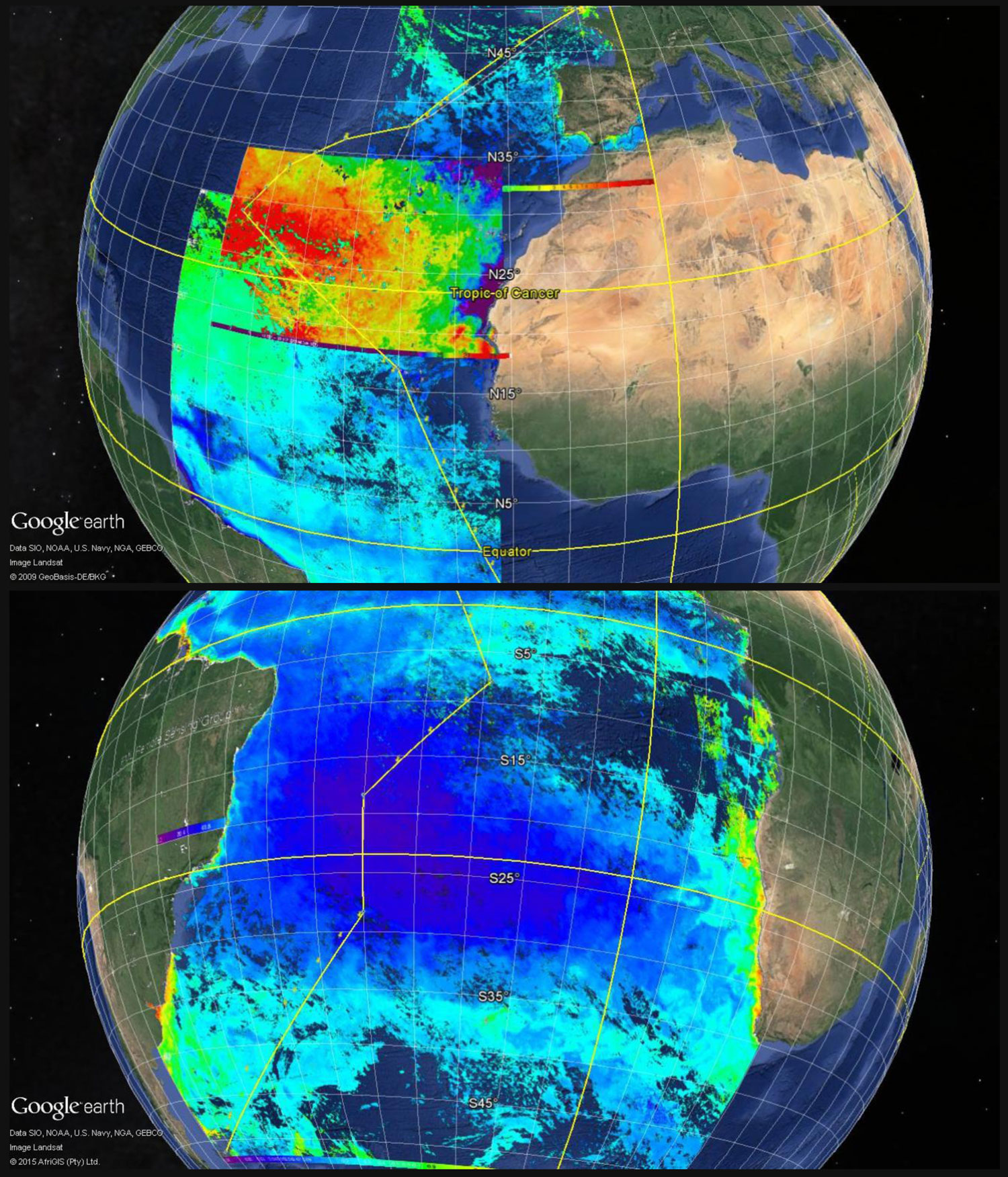 AMT was originally conceived to test and ground truth satellite algorithms of ocean colour, as the huge (>12,000km) transect passes through a wide range of ocean provinces and conditions, and importantly, crosses the sparsely sampled oligotrophic gyres, in the centre of the North and South Atlantic Oceans.
